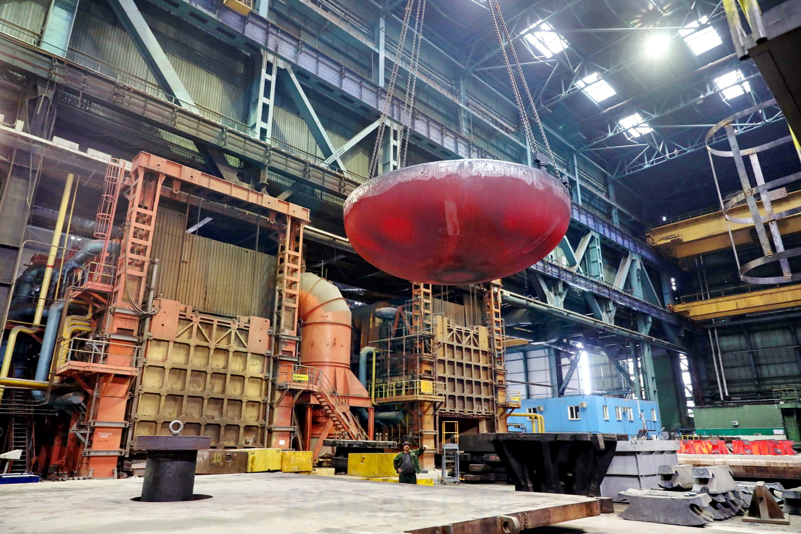 На термопрессовом участке заготовка диаметром 5300 мм, толщиной 80 мм и весом 18 тонн — нагревается при температуре 900 градусов около двух часов, затем температура нагрева увеличивается до 1050 градусов еще на два часа. С помощью специального штампа раскаленную плоскую заготовку усилием в 6000 тонно-сил преобразовывают в днище емкости системы пассивного залива активной зоны.