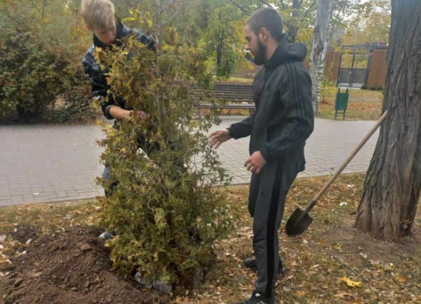 Безработные волгодонцы за деньги высадили деревья и кустарники в парке Победы
