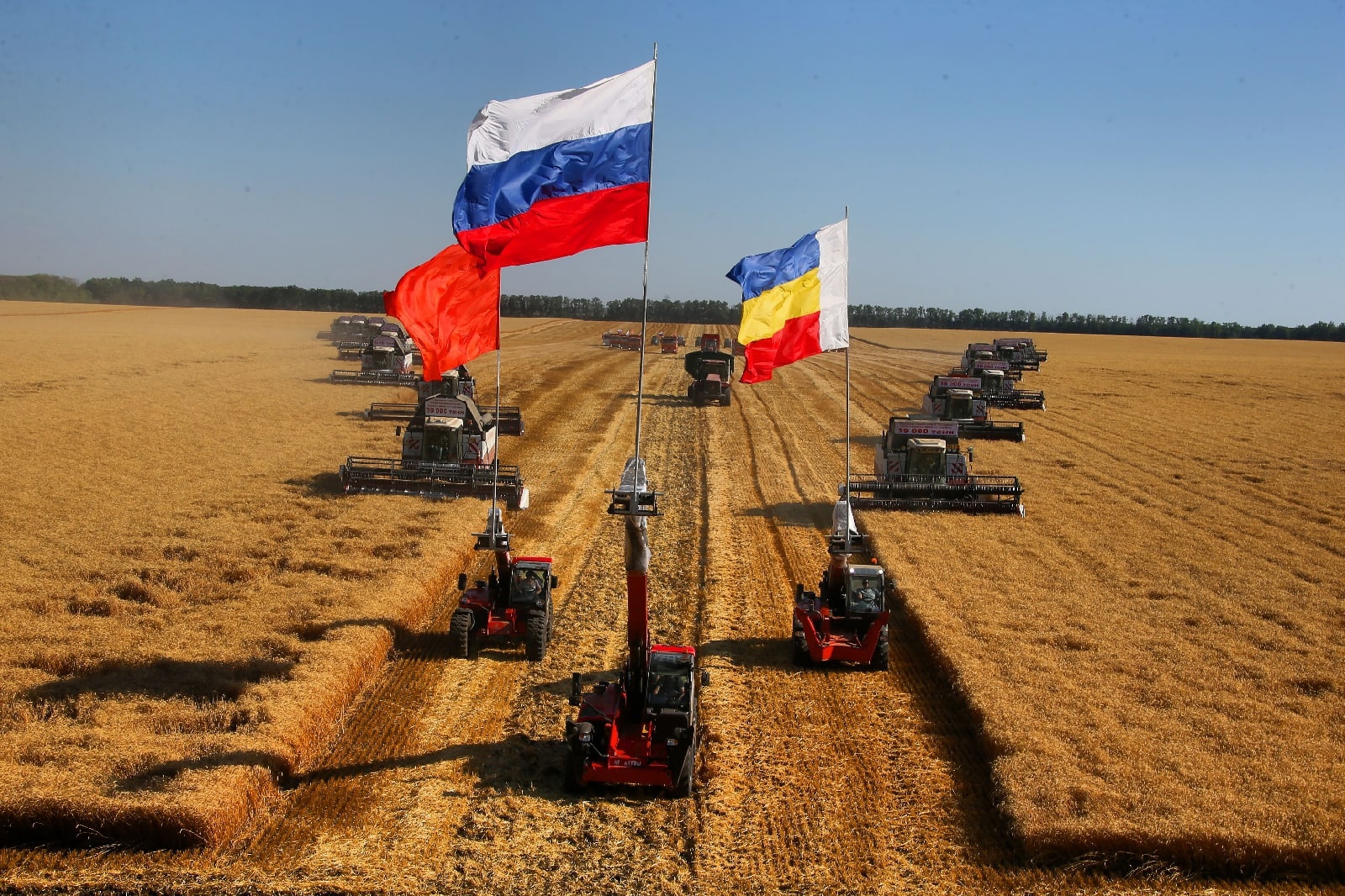 Вчера одно из ведущих предприятий Ростовской области - колхоз имени С.Г. Шаумяна Мясниковского района - в связи с получением рекордного урожая ранних зерновых культур торжественно завершил жатву парадом сельхозтехники, которая под знаменами России, Победы и Ростовской области собрала заключительный урожай пшеницы, пройдя по полю в виде буквы «V».