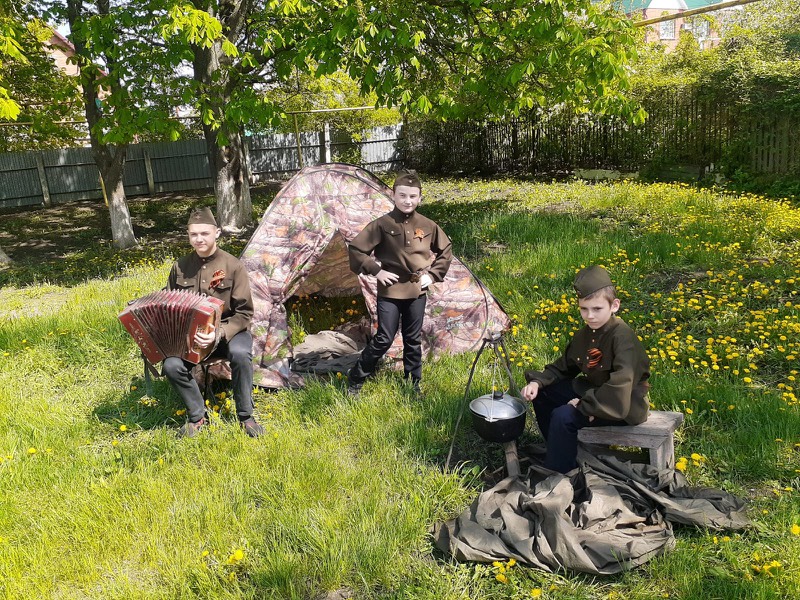 Вторым этапом акции было размещение фото инсталляции на тему "Солдатский привал". Дети в военной форме инсценировали эпизод из военной жизни. Заключительным этапом акции стало исполнение песни военных лет. Сотрудники вместе с воспитанниками исполнили песню "Синий платочек".