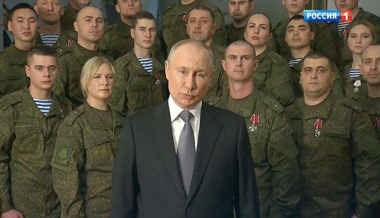 Как знает вся страна, обычно президент РФ поздравляет население на фоне Кремля. Но в 2022 году сделано исключение. В канун наступающего 2023 года Путин произнес свою речь в окружении военных.