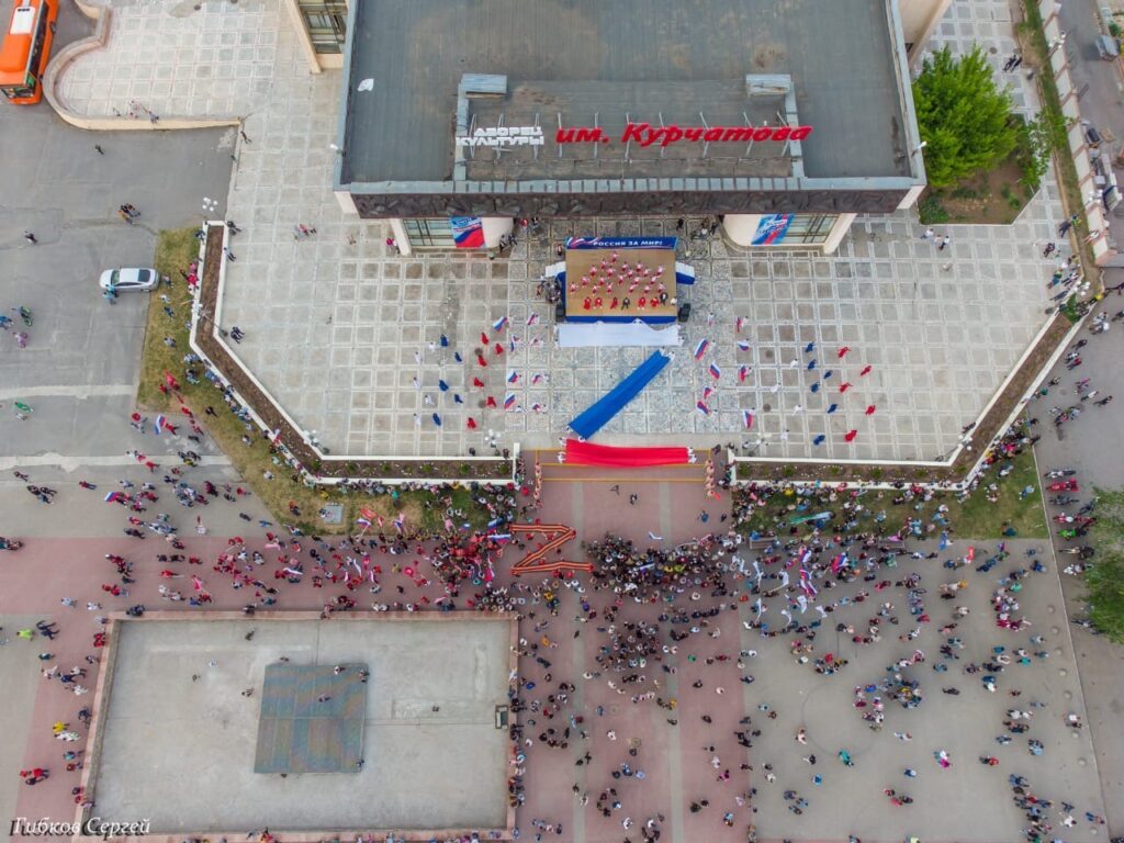 Из полотен цветов триколора России хореографические коллективы ДК им. Курчатова выстроили букву Z. А студенты ВИТИ НИЯУ МИФИ подняли над головам большую георгиевскую ленту также в форме буквы Z.