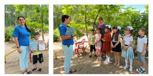 За создание видеоролика педагоги С.И.Буланова и М.О.Архипова награждены благодарственным письмом председателя Совета ВДПО Ростовской области В.В.Пилипец. Инструктор по противопожарной профилактике ВДПО Обливского района В.Э.Цуркан вручила воспитанникам ДОУ памятные подарки и благодарственные письма за участие в видеоролике посвященном «130- летию ВДПО».