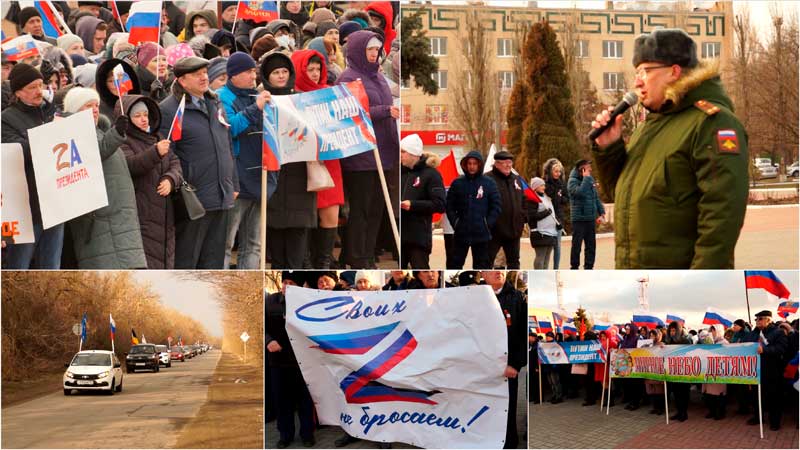 Началось все с районного автопробега: три колонны автомобилей, первая выехала с юга района из станицы Мелиховской попутно к ней присоединились автолюбители из станицы Раздорской, хутора Пухляковский и хутора Крымский, вторая автоколонна с севера района стартовала из ст.Усть-Быстрянской, к которой присоединились жители станицы Нижнекундрюченской и станицы Верхнекундрюченской, третья колонна выехала из хутора Апаринского, конечная точка автопробега находилась в центре поселка Усть-Донецкий, где автомобилисты выстроили из машин символы «Z» и «V», а сами люди приняли участие в митинге-концерте.