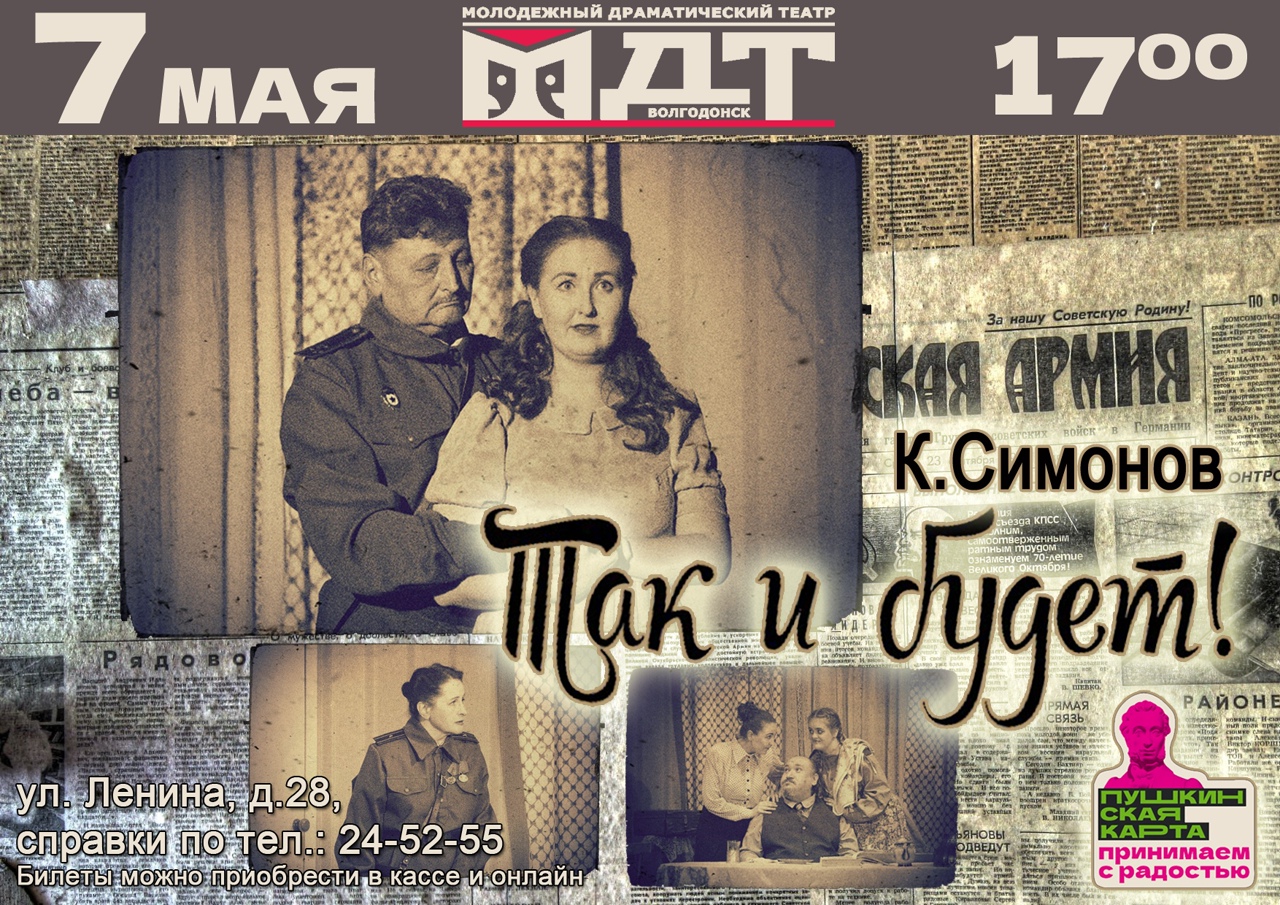 В преддверие нынешнего Дня Победы – 7 Мая – Волгодонский молодежный драматический театр покажет спектакль «Так и будет» по пьесе Константина Симонова.