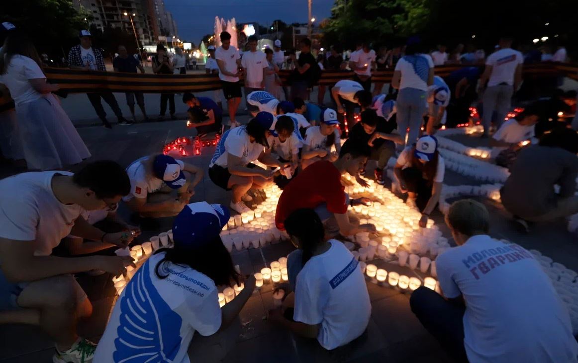 Ростовская область, 22 июня 2022. DON24.RU. В Ростове вечером 21 июня на площади Гагарина перед ДГТУ прошла акция «Огненные картины войны». Сотни горожан и гостей города разных возрастов собрались на площади Гагарина почтить память погибших. Активисты выложили из тысяч мемориальных свечей образ мемориала жертвам фашизма в Змиевской балке и надпись: «Ростов помнит».