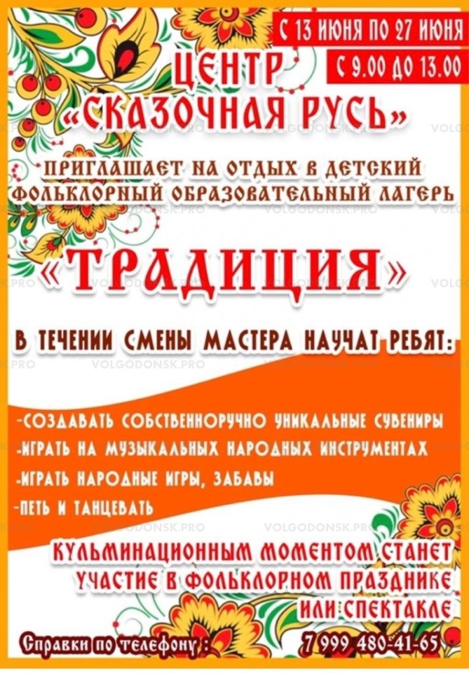 Дворец культуры им. Курчатова приглашает юных волгодонцев принять участие в фольклорном образовательном лагере «Традиция», который откроется в центре «Сказочная Русь» (переулок Ноябрьский, 16). Лагерь будет работать с 13 по 27 июня.