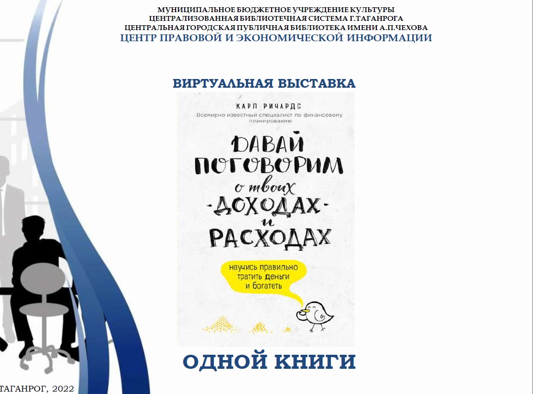 Приглашаем ознакомиться с книгой «Давай поговорим о твоих доходах и расходах: научись правильно тратить деньги и богатеть» в Центр правовой и экономической информации по адресу: ул. Греческая, 105, комната 204.