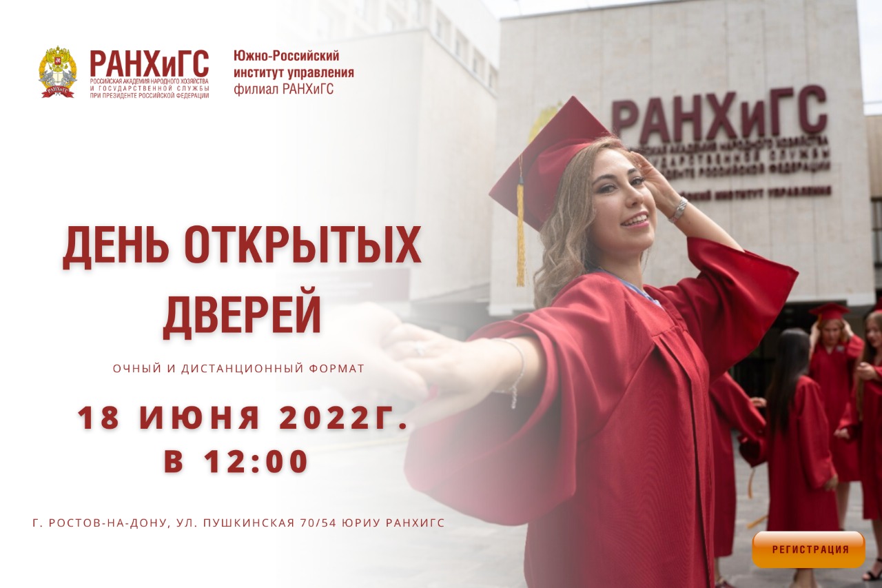 В честь старта приемной кампании 18 июня 2022 года в 12.00 Южно-Российский институт управления РАНХиГС при Президенте Российской Федерации приглашает учащихся 9-11 классов и их родителей на День открытых дверей в очном формате по адресу ул. Пушкинская 70/54.
