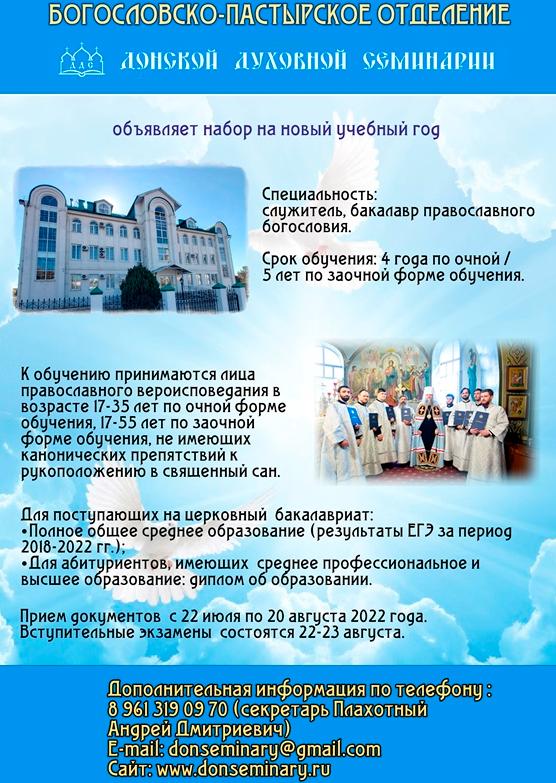 Донская духовная семинария объявляет дополнительный набор на богословско-пастырское отделение на 2022-2023 учебный год