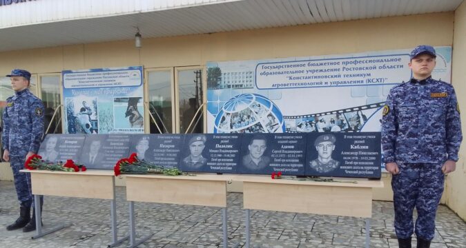 Константиновск. ДОНСКИЕ ОГНИ. 3 марта в Константиновском техникуме агроветтехнологий и управления (КСХТ) прошел торжественный митинг, посвящённый открытию мемориальных досок памяти выпускникам КТАУ (КСХТ), погибшим при исполнении воинского долга в ходе военных операций в Чечне и в зоне проведения специальной военной операции.