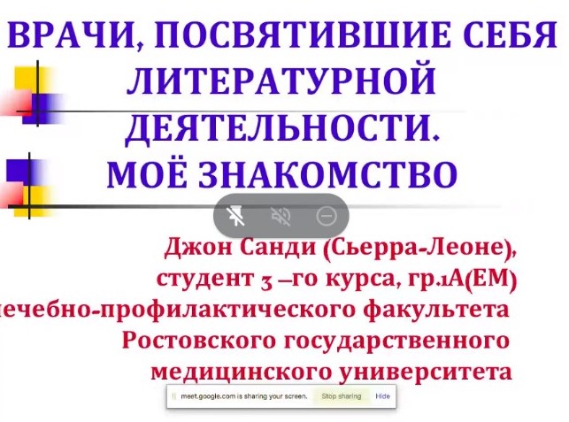 О своем знакомстве с русскими врачами, посвятившими себя литературной деятельности, рассказывает студент 3 курса ЛПФ ЕМ Джон Санди (Сьерра-Леоне)Большой интерес вызвал доклад «Чудесный доктор» Пирогов», сделанный учащимся подготовительного факультета РосГМУ Мунгемба Мбусса Принснел (Конго)Доклад «Земская медицина в творчестве А.П.Чехова» представил учащийся подготовительного факультета Мадингу Дон Крис Жуниор (Конго)С докладом «Образ врача в повести В.В.Вересаева «Записки врача» выступил учащийся подготовительного факультета Аль Саади Марван Амер (Ирак)Большой интерес аудитории вызвал доклад «Доктор Михаил Булгаков» о жизни и раннем творческом периоде великого русского писателя, представленный студентом 2 курса ЛПФ ЕМ Зиа Ахмед Мисбах (Индия)Своими впечатлениями о рассказе «Стальное горло» М.А. Булгакова поделилась студентка 2 курса ЛПФ ЕМ Сетх Элиша (Индия)Статусному убеждению в медицинском дискурсе на материале рассказа М.А. Булгакова «Звездная сыпь» посвящено выступление студента 2 курса ЛПФ ЕМ Мирзы Итешама (Индия)Студент 3 курса ЛПФ ЕМ Рахи Алексей (Нигерия) подготовил доклад «Путь в медицину (по роману В. Каверина “Открытая книга”»Студент 3 курса ЛПФ ЕМ Фарух Мохаммад (Индия) представил интересное размышление на тему «Практика месмеризма в новелле Э.А. По «Правда о том, что случилось с мистером ВальдемаромО популяризации медицинских знаний в творчестве замечательного русского хирурга Николая Амосова рассказала студентка 2 курса ЛПФ ЕМ Верма Ити (Индия)