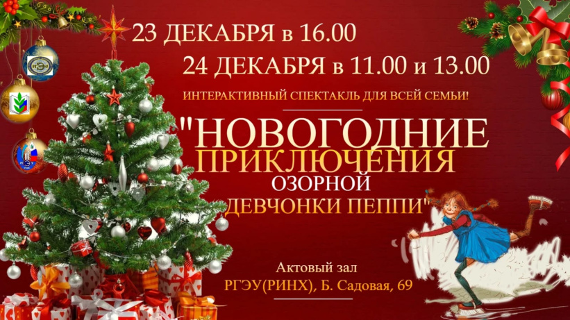 23 декабря в 16:00 и 24 декабря в 11:00 и 13:00 в актовом зале РГЭУ (РИНХ) пройдет интерактивный спектакль для всей семьи «Новогодние приключения озорной девчонки Пеппи».