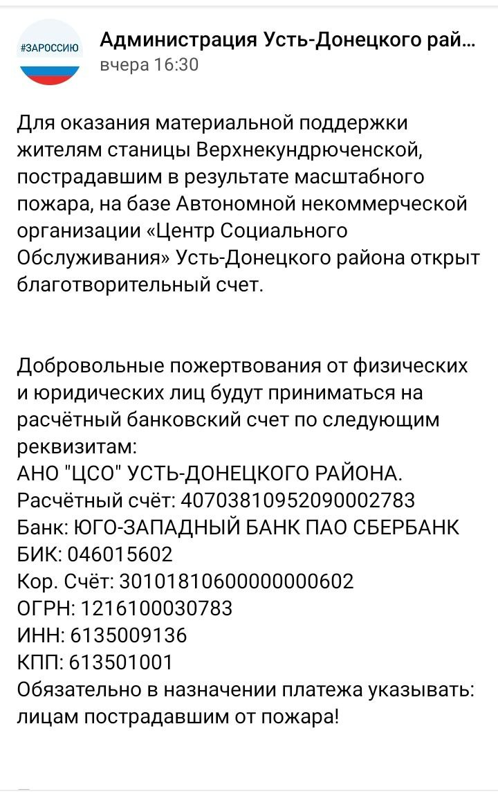 Помощь жителям станицы Верхнекундрюченской, пострадавшим в результате пожара