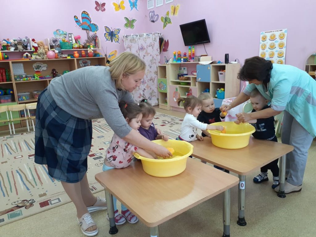 В группе №1 «Капитошки» воспитатели и педагог — психолог проводят игры с водой. Водотерапия — это эффективный метод коррекции психоэмоциональной сферы детей. Она позволяет ребенку расслабиться, снять напряжение. Малышу, испытывающему нагрузки в период адаптации к детскому саду, психологические разгрузки особенно нужны. Дети с удовольствием играют с теплой водичкой. Игры с водой создают у детей радостное настроение, повышают жизненный тонус, дают детям массу приятных и полезных впечатлений.