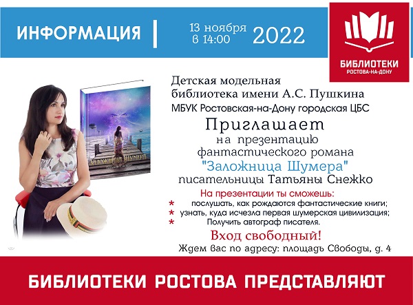 В воскресенье, 13 ноября 2022 года в 14:00, в Детской модельной библиотеке имени А.С. Пушкина МБУК Ростовская-на-Дону городская ЦБС состоится презентация фантастического романа «Заложница Шумера»(16+) писательницы Татьяны Снежко.
