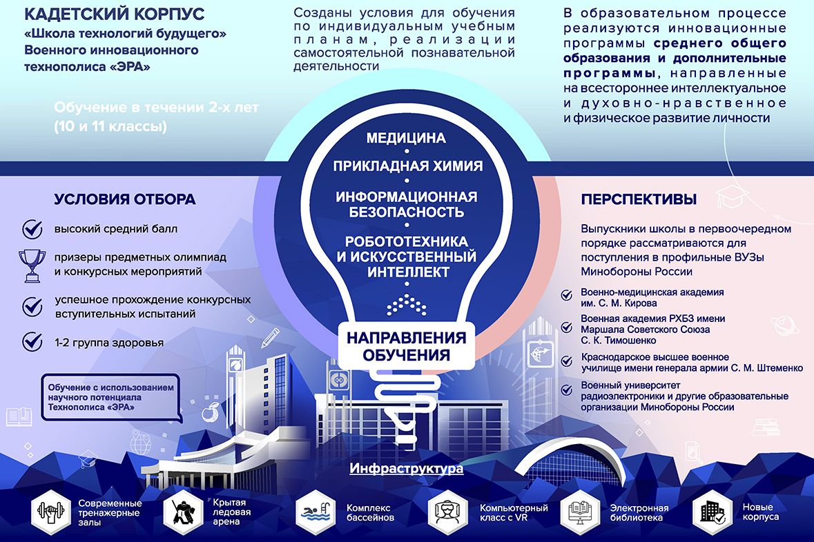 Подготовка воспитанников кадетского корпуса будет организована по направлениям: медицина будущего, прикладная химия, информационная безопасность, робототехника и искусственный интеллект.
