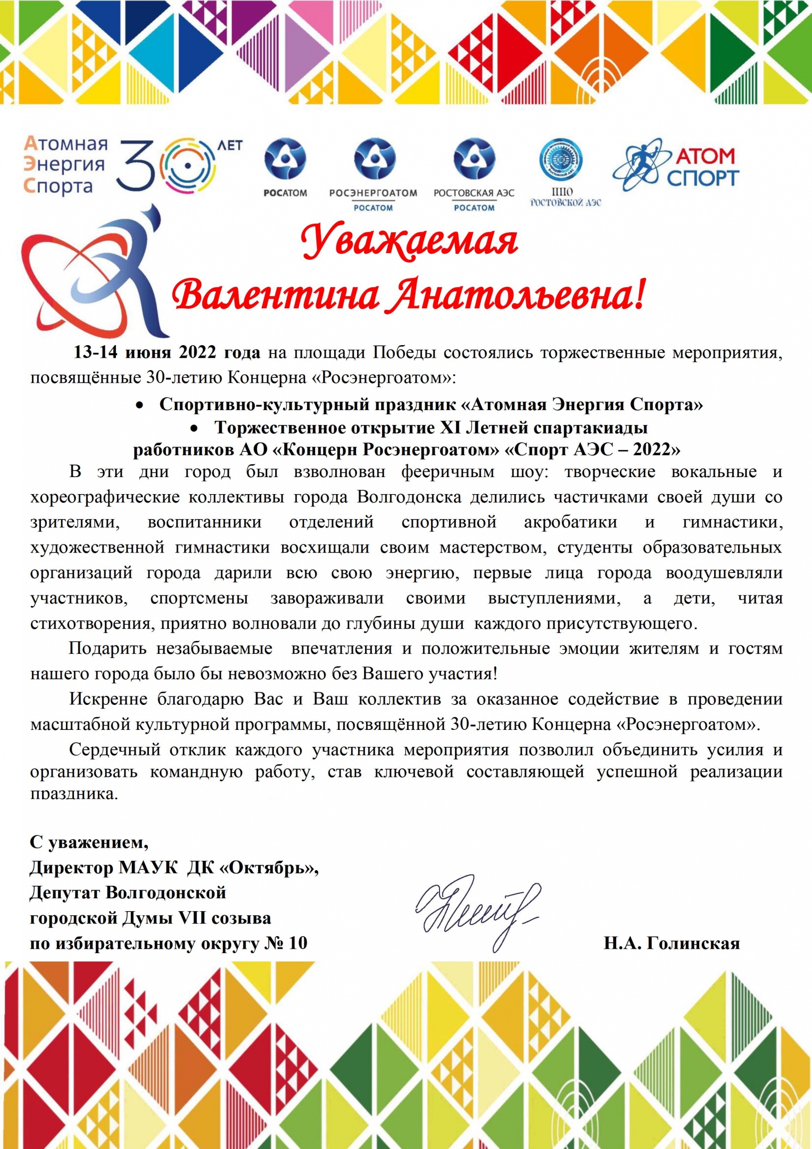 - Подарить незабываемые впечатления и положительные эмоции жителям и гостям нашего города было бы невозможно без вашего участия! Искренне благодарю Вас и Ваш коллектив за оказанное содействие в проведении масштабной культурной программы, посвященной 30-летию Концерна «Росэнергоатом».