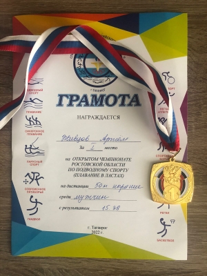 Студент факультета физики, математики, информатики Таганрогского института имени А.П. Чехова (филиала) РГЭУ (РИНХ) Артём Андреевич Живцов принял участие в Открытом Чемпионате Ростовской области по подводному спорту (плавание в ластах). По итогу соревнований Артём занял призовые места — золото и серебро у нашего студента.