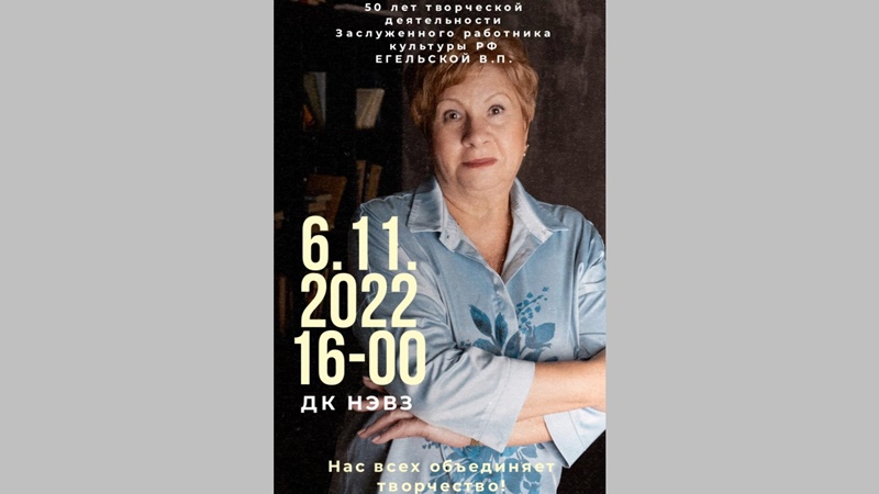 В Новочеркасске в ДК НЭВЗа 6 ноября в 15:00 пройдет творческая встреча, посвященная 50-летию деятельности заслуженного работника культуры РФ Валентины Егельской «Нас всех ведет Творчество! Полвека бурлит жизнь!».