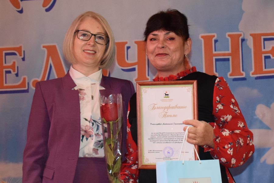 Глава вручила благодарственные письма Администрации Целинского района Лукерье Григорьевне Воробьевой, Анне Алексеевне Рыбиной, Антонине Григорьевне Рязанцевой, Марине Владимировне Мищенко, Людмиле Ивановне Борисовой. Все они вносят личный вклад в сохранение культурного наследия духоборческой общины Целинского района и много лет участвуют в организации просветительских мероприятий по популяризации культурных ценностей духоборцев.