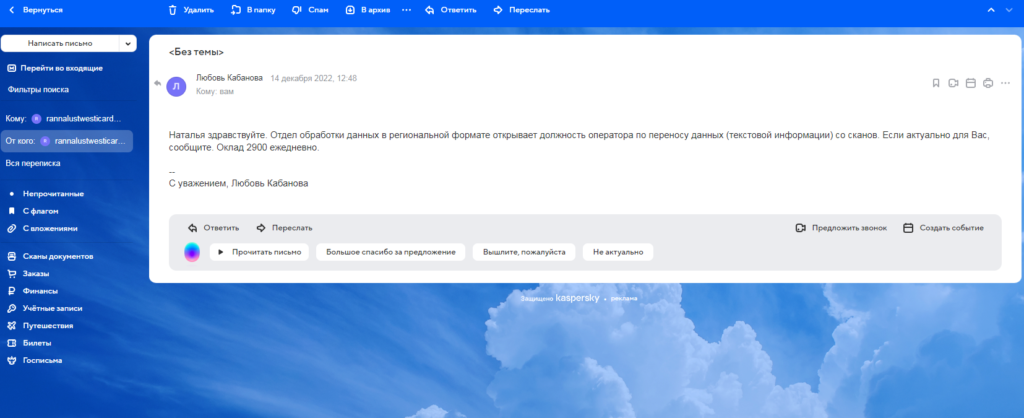 В этот раз на электронную почту нашего выпускающего редактора Натальи Ковалевой пришло довольно-таки интересное письмо. Далее традиционно повествование от «потенциальной жертвы» мошенников.