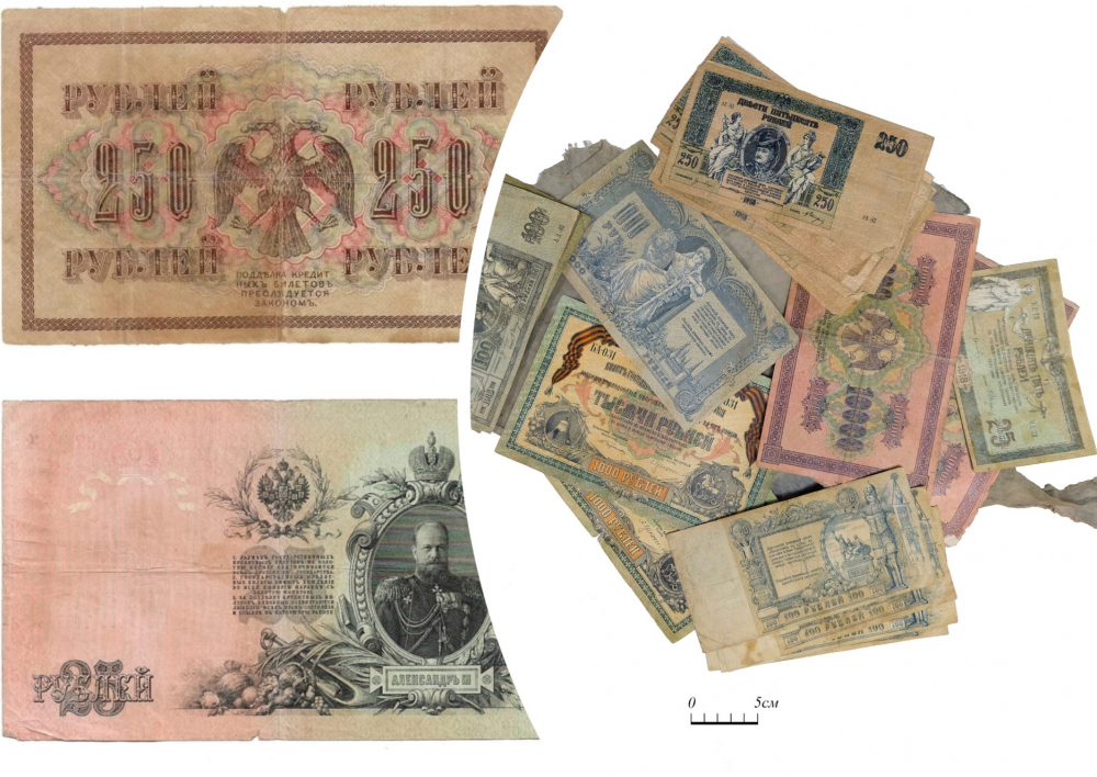 — Археологами обнаружили 156 денежных купюр на сумму 30675 рублей. Деньги были завернутые в отрезок ткани, — уточнили в ОКН.