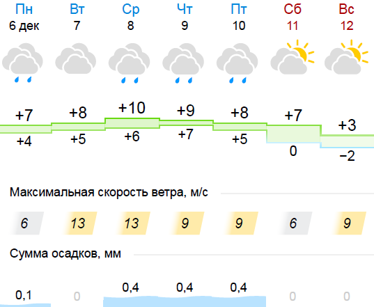 7 и 8 декабря, по прогнозам синоптиков, станут самыми тёплыми днями этой недели. Днём воздух будет прогреваться до +8…+14 °С. Ночью ожидается от +4 °C до +8 °С. В эти двое суток, а также до конца недели дождей в регионе не прогнозируется, но пасмурная погода сохранится.