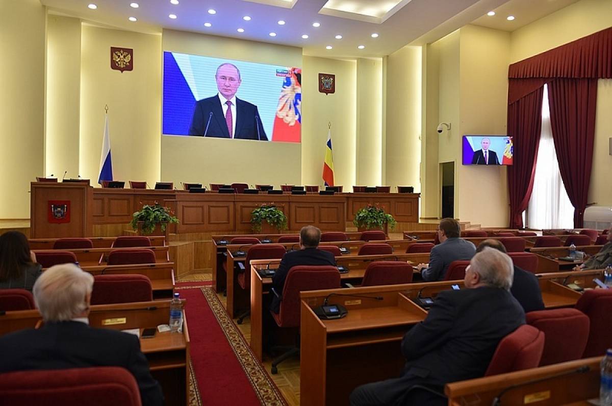 Прямую трансляцию выступления Президента Владимира Владимировича Путина и церемонию подписания договоров о принятии в состав России Донецкой и Луганской народных республик, Запорожской и Херсонской областей депутаты донского парламента смотрели вместе в конференц-зале Правительства Ростовской области.