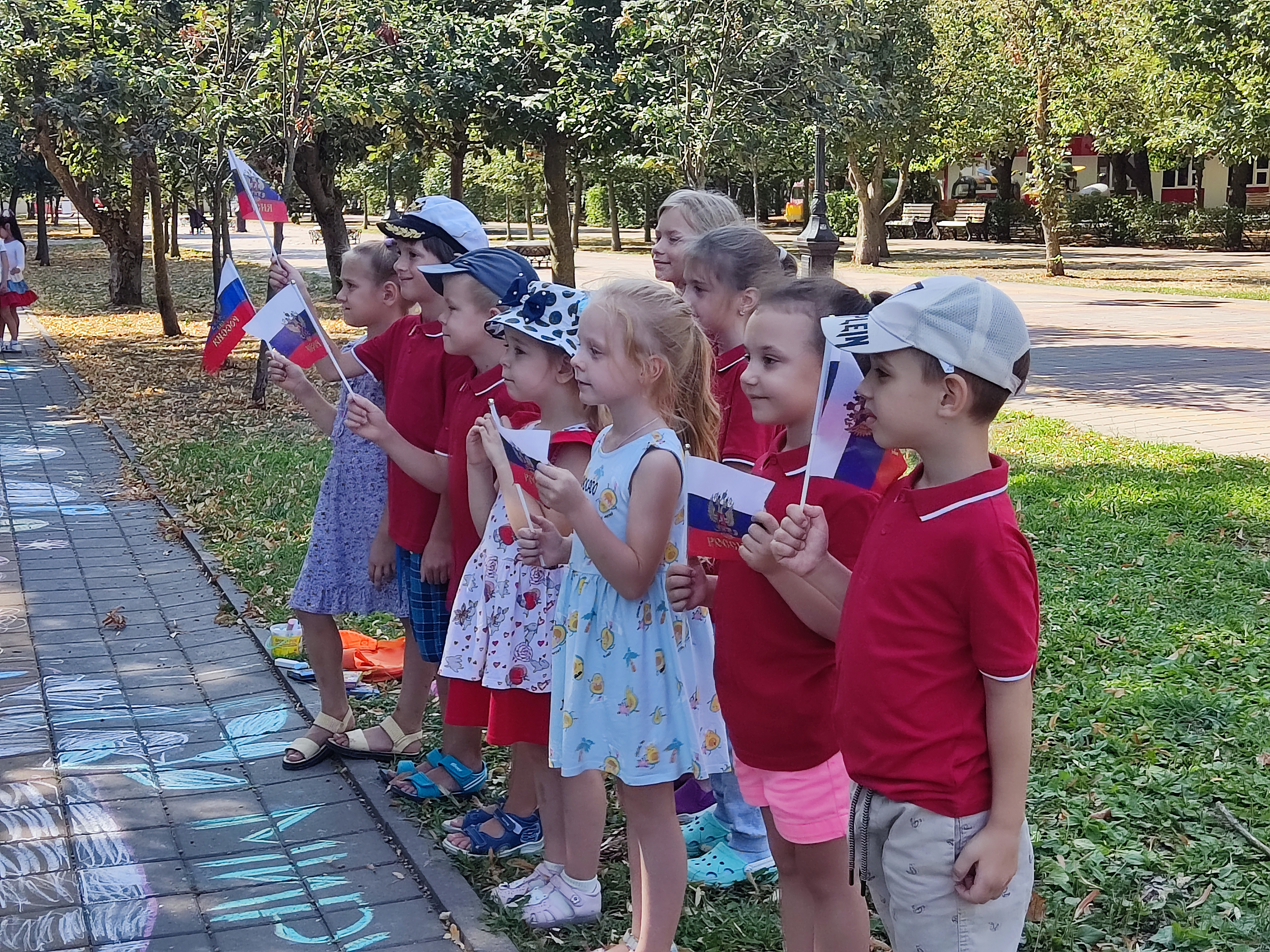 Дети рисовали не только флаги, но и цветы, дома и даже солнце из триколора. Кто-то из воспитанников детских садов устроил соревнование, а кто-то свою совместную игру.