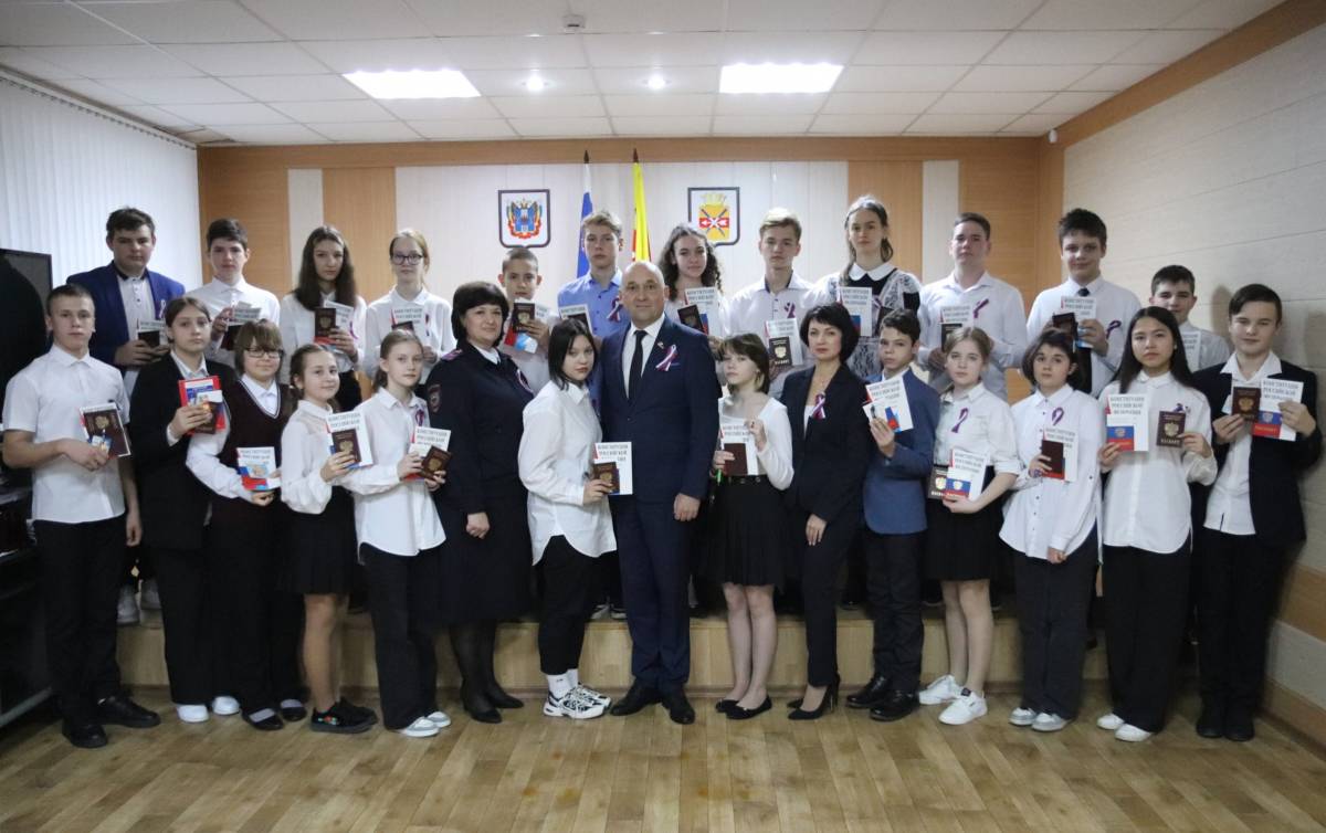 В честь Дня Конституции в администрации Тацинского района состоялось вручение паспортов юным гражданам РФ. В торжественной обстановке член местного политсовета «Единой России» Сергей Сягайло и начальник районного отделения по вопросам миграции Ольга Железникова поздравили ребят с получением главного документа.