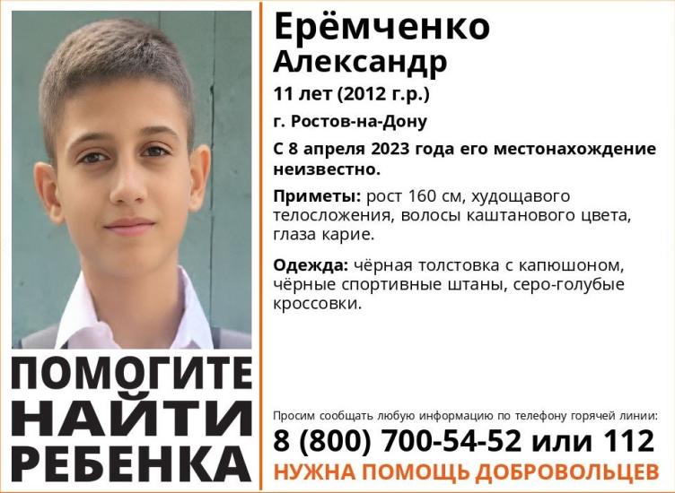 Ростовская область,10 апреля 2023. DON24.RU. В Ростове разыскивают без вести пропавшего 11-летнего школьника. Как сообщили в поисковом объединении «ЛизаАлерт», где находится Александр Еремченко неизвестно с 8 апреля.