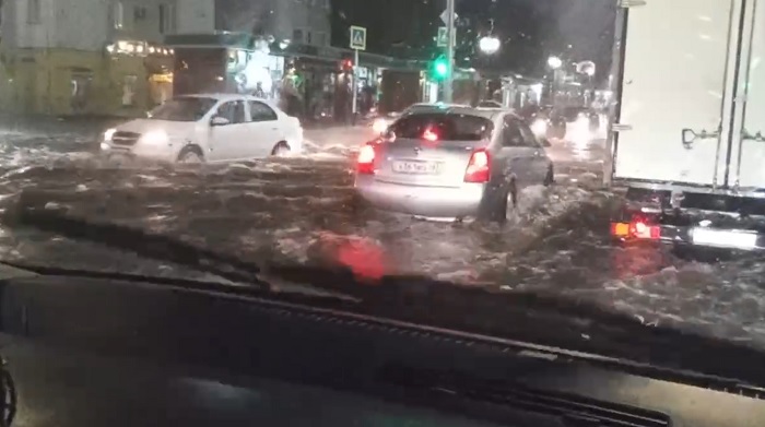 В городе затопило дороги и тротуары, машины передвигались, словно по реке, а люди побаивались переходить дорогу, сообщили очевидцы.