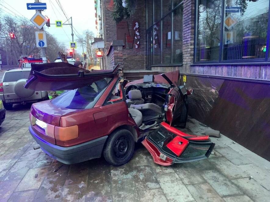 ЧП случилось примерно в 7:30 утра 25 декабря. По предварительным данным, 21-летний парень за рулём старенькой Audi врезался в автобус №98, после чего автомобиль влетел в стену ресторана Matador.