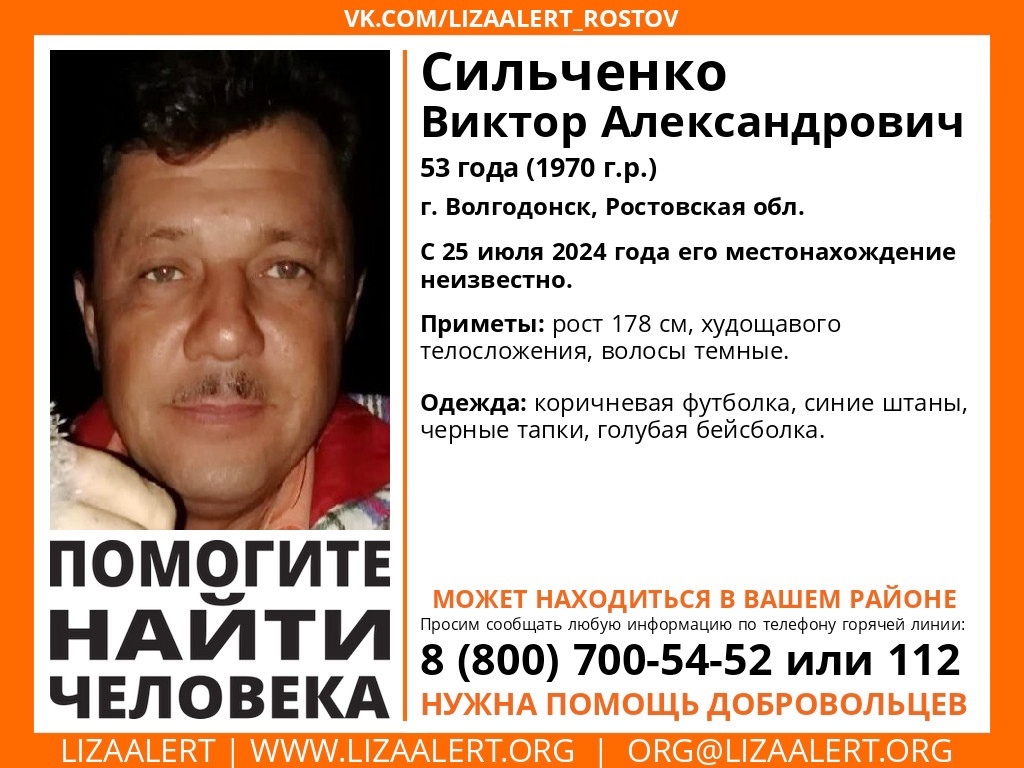 Как сообщает поисковый отряд «Лиза Алерт» Ростовской области, в нашем городе пропал 53-летний мужчина. По данным волонтеров, его исчезновение произошло на фоне неясных обстоятельств, что вызывает особую тревогу среди родных и близких. В связи с этим, они призывают всех, кто имеет какую-либо информацию о его местонахождении, немедленно связаться с ними.