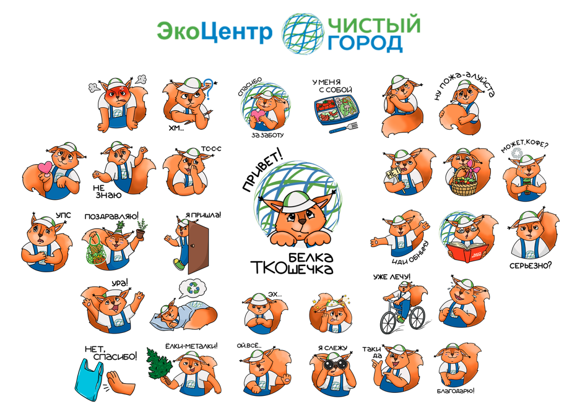 Главным героем экологичного стикерпака стал символ компании, которого в 2019 году в ходе голосования в соцсетях выбрали жители Дона. Это белка ТКОшечка.