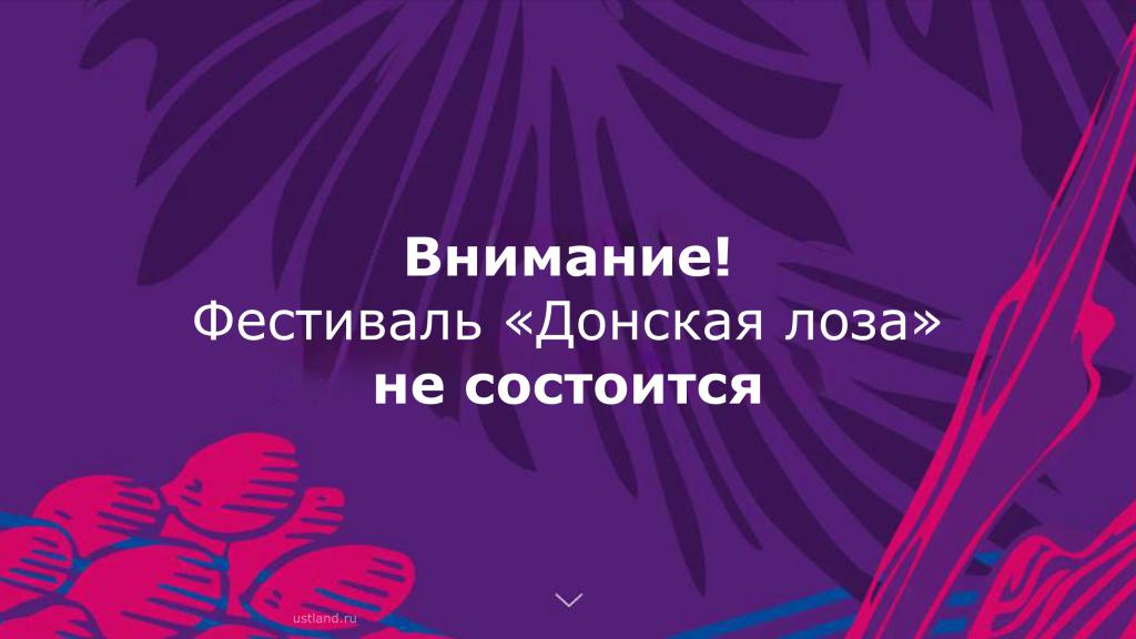 С сожалением сообщаем, что по официальной информации Министерства экономического развития Ростовской области, фестиваль «Донская лоза», который запланирован на 7 октября в хуторе Пухляковском,