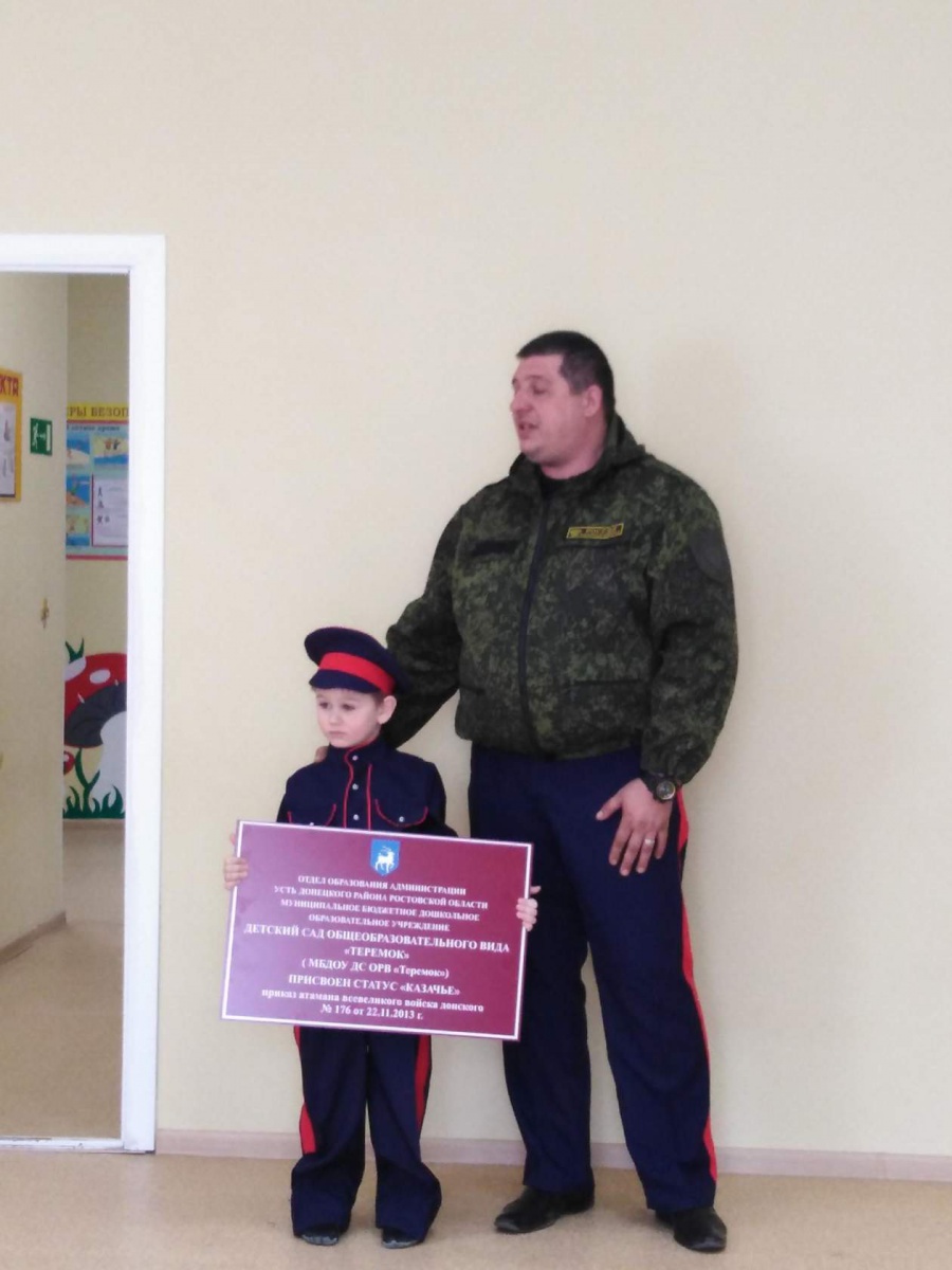 Атаман Алексей Малютин подарил детскому садику вывеску с указанием статуса "казачий", присвоенного приказом атамана Всевеликого Войска Донского №176, а также юным казакам и казачкам подарил книгу "Сказки донских писателей".