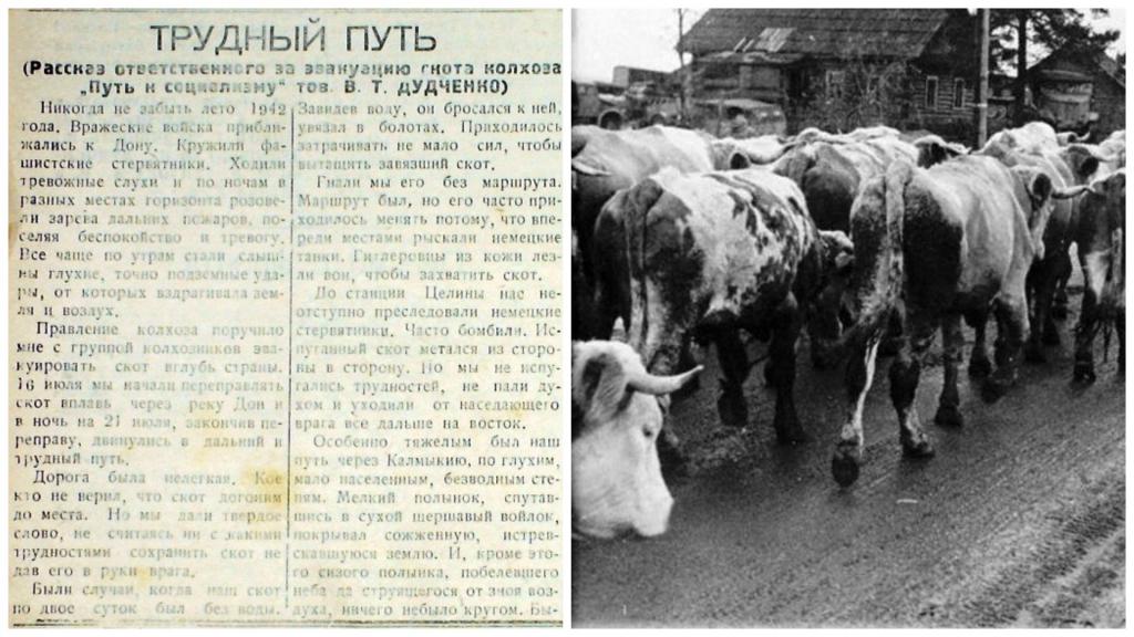 Память о героях войны и мирных жителях, пострадавших от фашистской оккупации, хранят многочисленные мемориалы в городах и районах Ростовской области. К этой юбилейной дате сотрудники архивных учреждений области производят отбор документов, которые будут опубликованы в сборнике «Летопись Победы и хроника чувств. Письма дончан с фронтов Великой Отечественной войны». Задача архивистов – сохранить в памяти будущих поколений события этого страшного периода, имена тех, кто ценой своей жизни отстоял свободу и независимость нашей малой родины. В архив Администрации Усть-Донецкого района документы периода оккупации с июля 1942 г. по февраль 1943 г. на хранение не поступали. Сохранились материалы периода освобождения с февраля 1943 года. Для включения в сборник отобрана статья из газеты Раздорского района «Советский Дон» об эвакуации скота колхоза «Путь к коммунизму» Мелиховского сельсовета, в которой ответственный за эвакуацию В.Т. Дудченко рассказывает о том, как группе колхозников удалось переправить скот через р. Дон и увести стадо вглубь страны в Дербентский район Дагестанской АССР.
