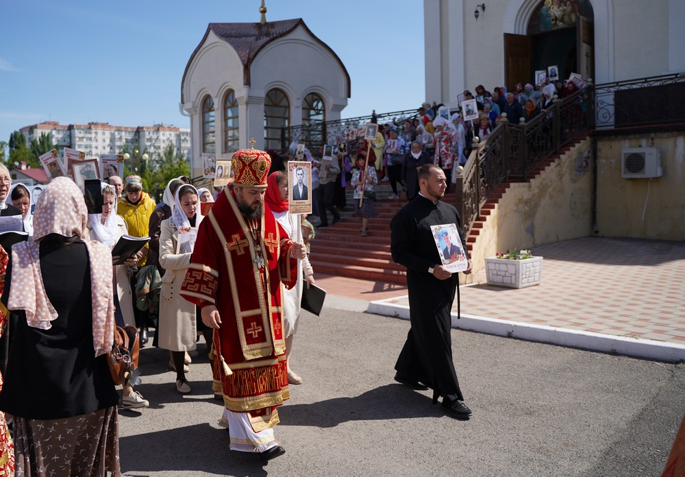 После Литургии состоялся традиционный для пасхальных дней крестный ход, но так как богослужение совпало с Днём Победы, верующие по благословению владыки Антония прошли вокруг храма с портретами родных и близких – участников войн, тем самым объединив крестный ход с акцией «Бессмертный полк».