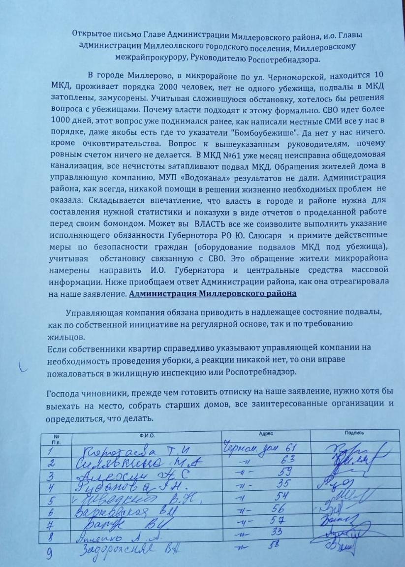 В городе Миллерово, в микрорайоне по ул. Черноморской, находится 10 МКД, проживает порядка 2000 человек, нет ни одного убежища, подвалы в МКД затоплены, замусорены.