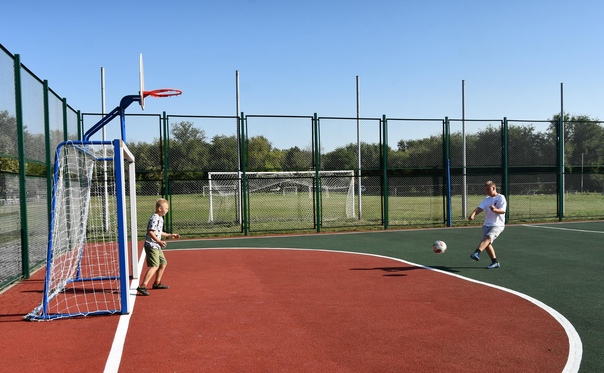 Площадка огорожена, имеет специализированное покрытие и спортоборудование. Здесь можно играть в футбол, волейбол и баскетбол.