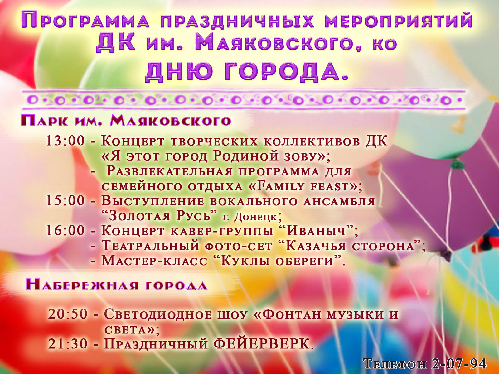 Скоро Каменск-Шахтинский отметит День города. К этой дате, 17 сентября, коллектив ДК им. Маяковского подготовил программу праздничных мероприятий!