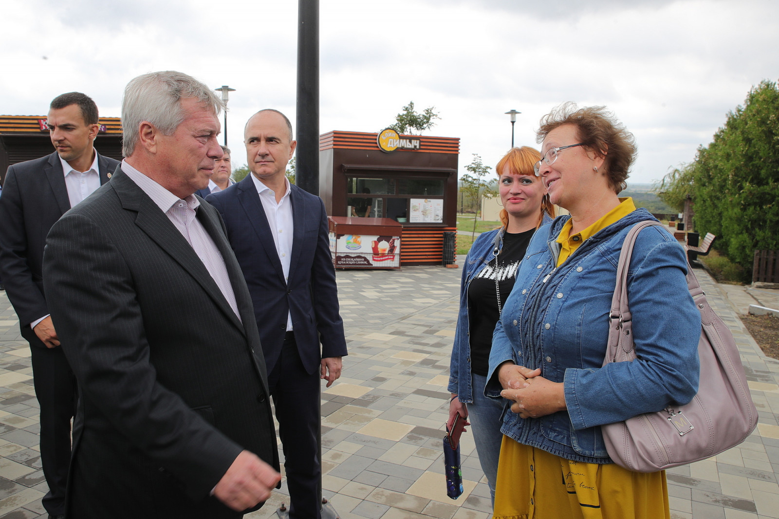 Донской губернатор осмотрел один из благоустроенных объектов Усть-Донецка – сквер «Юность», обновлявшийся в течение трех лет, а также побывал на выставке, где ознакомился с образцами коммунальной техники, светового уличного оборудования, экобоксов.