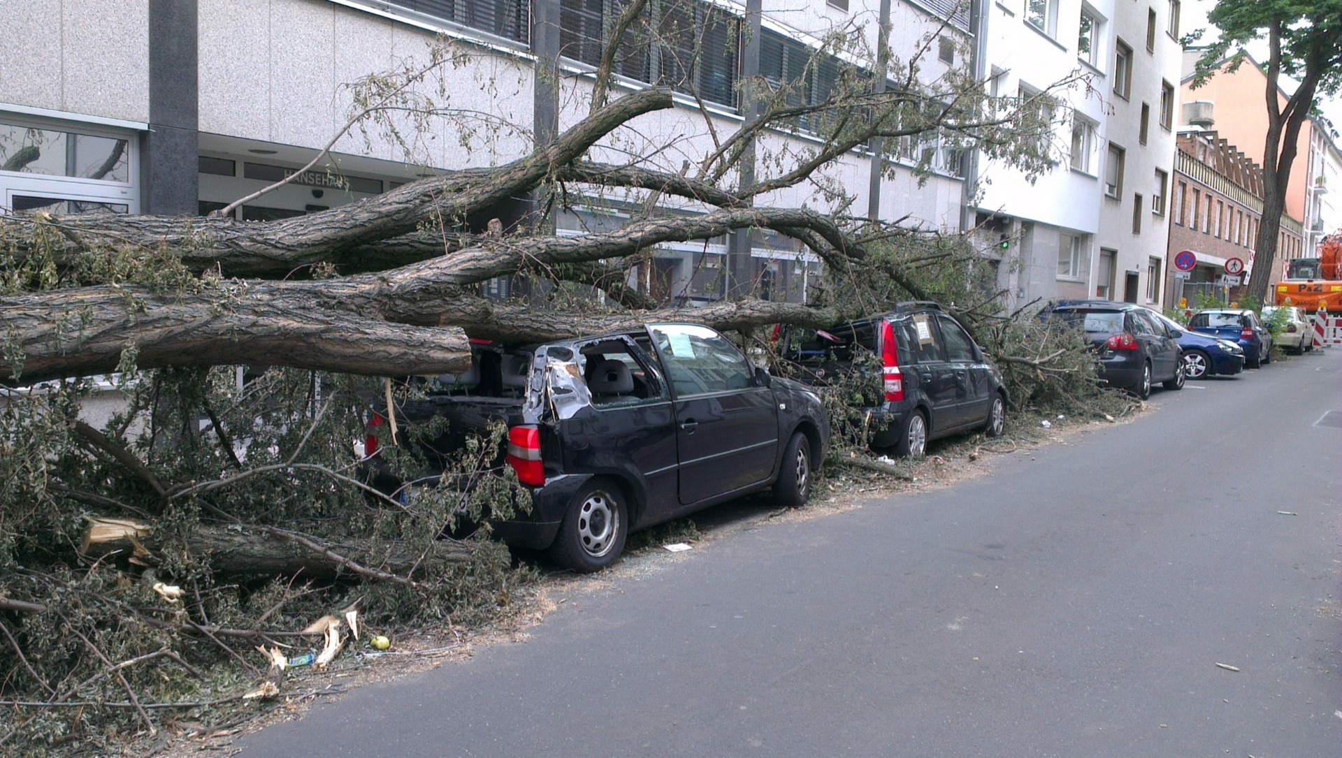Гроза с ливнем и порывистым ветром обрушила ветки дерева как минимум на три иномарки, припаркованные в Нахичевани на перекрестке улиц Советской и 16-й Линии.