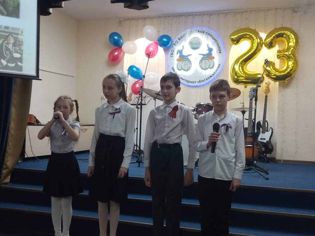 Торжественная часть мероприятия продолжилась в актовом зале. Директор школы-интерната Татьяна Белоусова поздравила защитников Отечества с наступающим праздником и от имени женской половины коллектива пожелала им здоровья, стойкости, мирного неба и гордости за Родину.