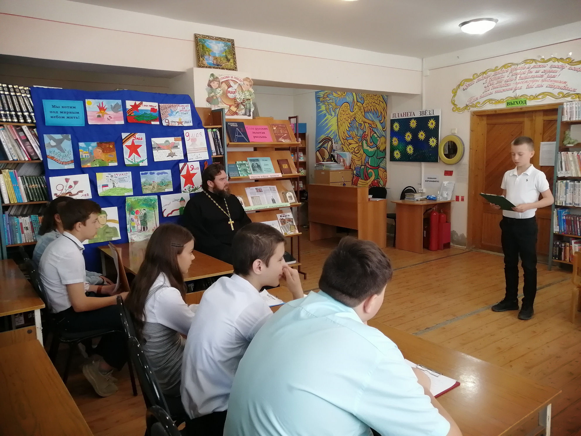 Настоятель храма Успения Пресвятой Богородицы отец Ростислав поздравил присутствующих с праздником и рассказал о жизни святых, о значении их работы. Ребята с большим вниманием слушали рассказ о значении славянской азбуки.