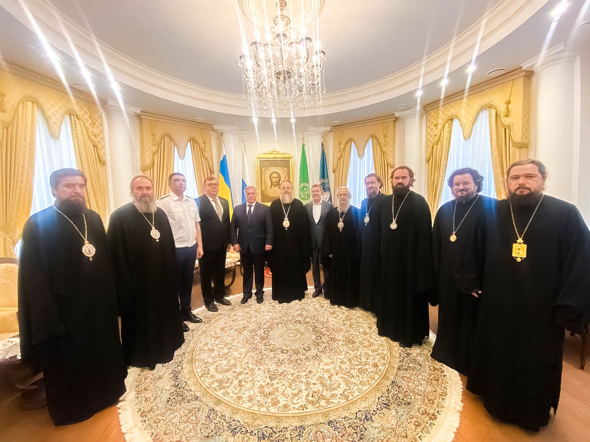 В соборной палате Ростовского кафедрального собора Рождества Пресвятой Богородицы встретились Губернатор Ростовской области Василий Голубев, Глава Донской митрополии митрополит Ростовский и Новочеркасский Меркурий, Председатель Законодательного собрания Ростовской области Александр Ищенко, заместитель полномочного представителя Президента РФ в ЮФО Владимир Гурба, атаман Всевеликого войска Донского Сергей Бодряков, Преосвященные владыки, прибывшие в город Ростов-на-Дону для участия в торжествах.
