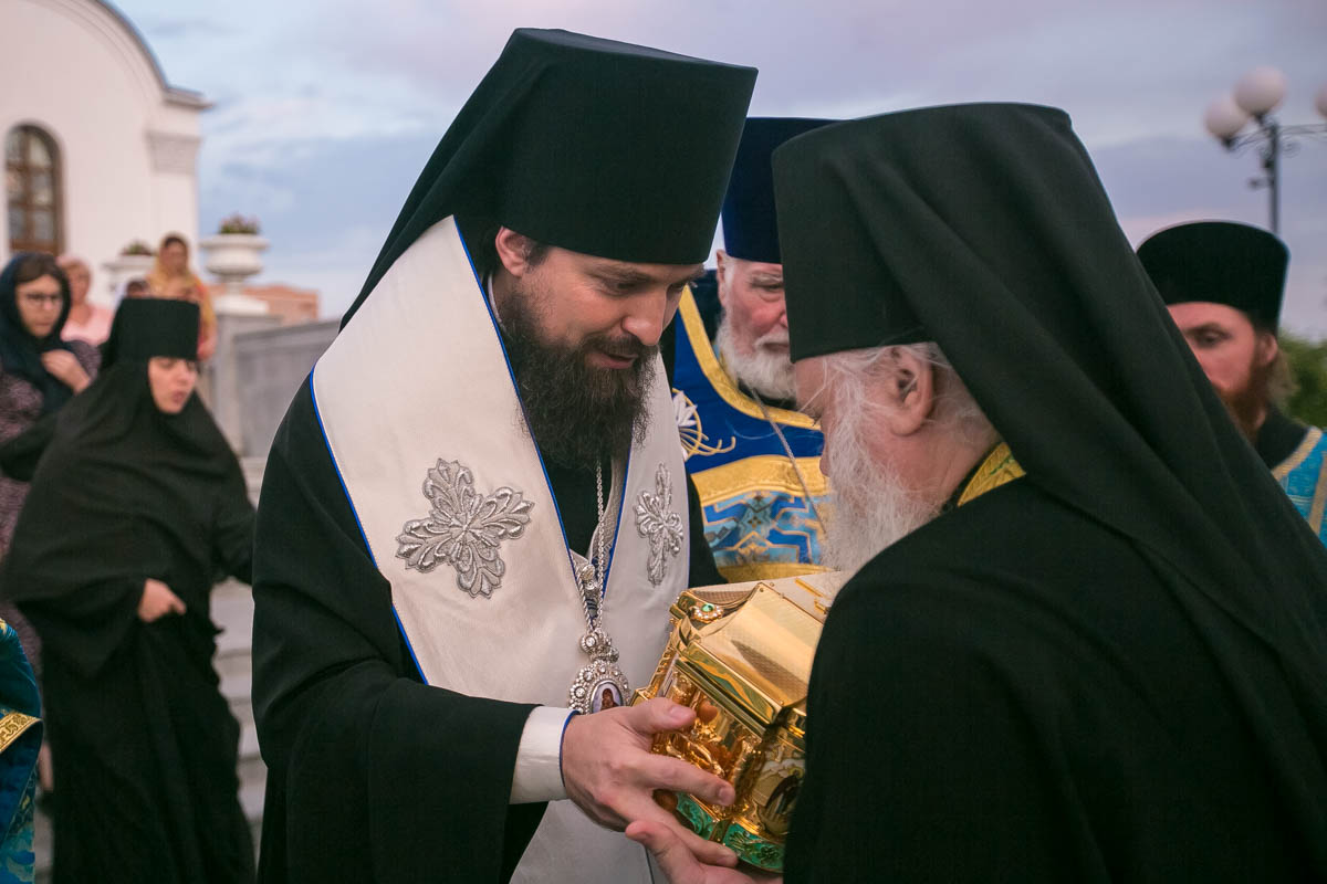В слове перед началом молебна Преосвященный владыка отметил молитвенный подвиг преподобного о пастве, собранной в обители Святой Троицы, о единстве всей земли русской. "Особенно и знаменательно," -подчеркнул епископ Артемий,- "что мы провожаем мощи преподобного Сергия в день памяти иконы Божией Матери «Донской», которая ознаменовала победу на Куликовом поле в дни земной жизни преподобного Сергия Радонежского".