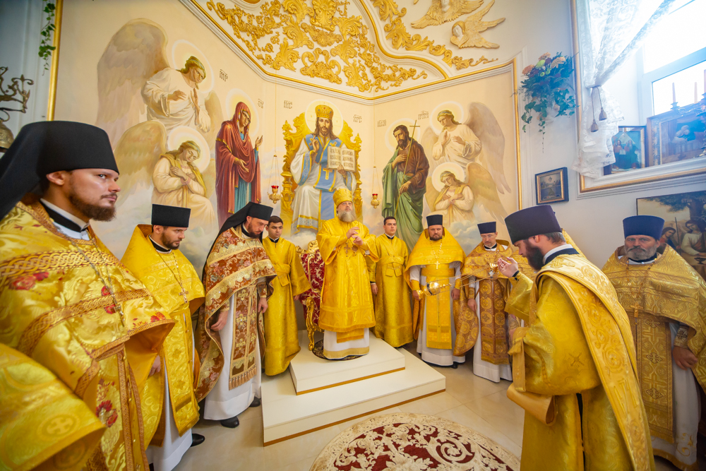 Его Высокопреосвященству сослужили благочинный Матвеево-Курганского округа иерей Евгений Фомин, настоятель Екатерининском храма иеромонах Михаил (Владимиров), благочинный Центрального округа протоиерей Александр Пятницкий, секретарь Епархиального управления Ростовской-на-Дону епархии иерей Димитрий Болотаев, клирики епархии.